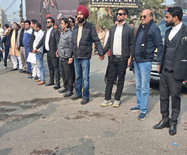 प्रचार के कई वाहन जब बेगमपुल पर पहुंचे तो वहां व्यापारियों ने मानव श्रृंखला बना कर जाम लगा दिया। इस मौके पर व्यापार संघ अध्यक्ष अजय गुप्ता, अंकित गुप्ता मनु, एडवोकेट उर्वशी, बेगमपुल व्यापार संघ के पूर्व अध्यक्ष पुनीत शर्मा, मेरठ बुलियन ट्रेडर्स के महामंत्री विजय आनंद अग्रवाल, खंदक के हैंडलूम वस्त्र व्यापारी संघ के प्रधान अंकुर गोयल, सरदार जी फोन्स,अमित बंसल आदि भी शामिल रहे। बाद में यहां से सभी लोग कचहरी के लिए रवाना हो गए। यहां अध्यक्ष संजय शर्मा के नेतृत्व में एडीएम सिटी ब्रिजेश सिंह को ज्ञापन दिया गया।