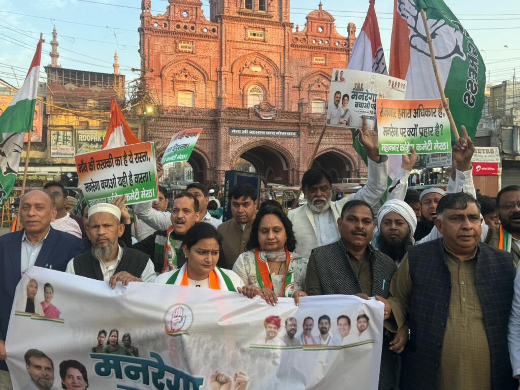 मेरठ। शहर कांग्रेस ने शुक्रवार को मनरेगा बचाओ यात्रा निकाली। इसमें बड़ी संख्या में कांग्रेसी शामिल हुए। महानगर अध्यक्ष रंजन शर्मा के नेतृत्व में कार्यकर्ता कांग्रेस कार्यालय, बुढ़ाना गेट पर एकत्रित हुए, जहाँ से क्रांतिकारी वीर मंगल पांडे की प्रतिमा पर माल्यार्पण कर पदयात्रा का शुभारंभ किया गया। पदयात्रा मंगल पांडे की प्रतिमा से आरंभ होकर बुढ़ाना गेट, सत्यम प्लाजा, खैर नगर चौराहा, छतरी वाला पीर, अहमद रोड, अस्पताल रोड होते हुए टाउन हॉल स्थित राष्ट्रपिता महात्मा गांधी की प्रतिमा पर समाप्त हुई। इस दौरान जमकर नारेबाजी की गयी। अध्यक्ष रंजन शर्मा ने कहा कि केंद्र की मोदी सरकार तानाशाही रवैये से देश चला रही है, जिससे गरीब एवं श्रमिक वर्ग का भविष्य खतरे में दिखाई दे रहा है। उन्होंने कहा कि कांग्रेस सरकार द्वारा लागू की गई मनरेगा योजना करोड़ों श्रमिक परिवारों के लिए जीवन रेखा साबित हुई है। यह योजना ग्रामीण क्षेत्रों में रोजगार का महत्वपूर्ण साधन है।