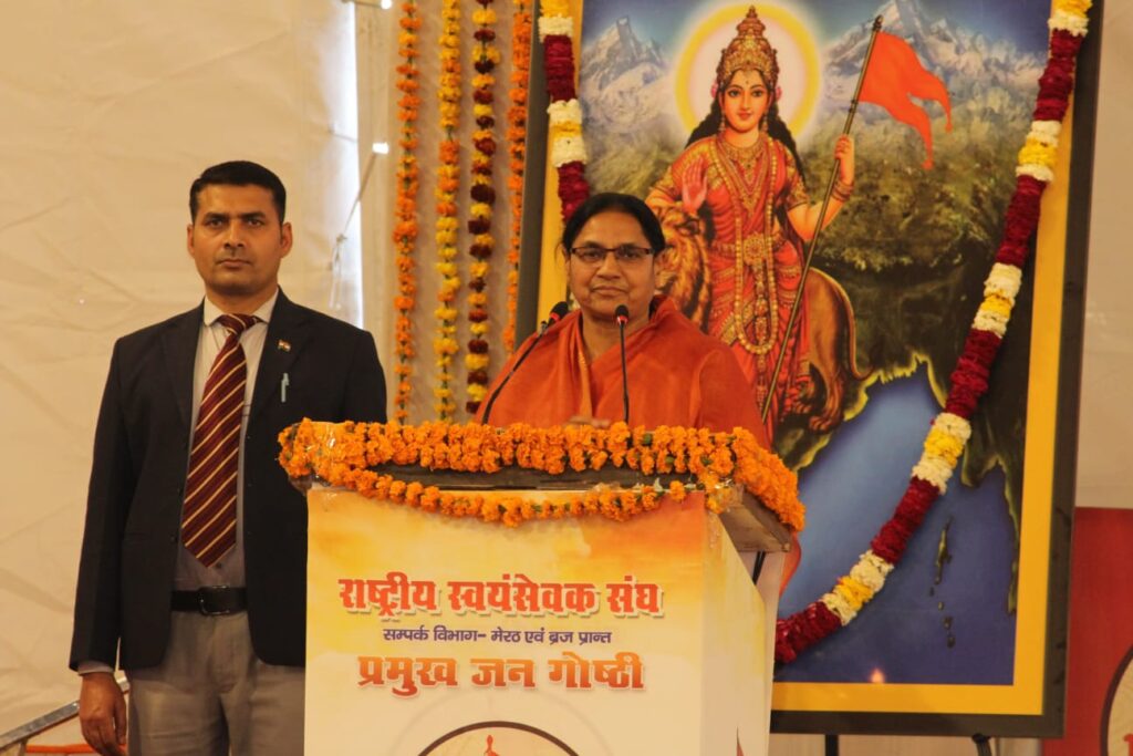 कार्यक्रम की विशिष्ट अतिथि चोटीपुरा गुरूकुल की संस्थापिका डॉ.उ सुमेधा आचार्य ने कहा कि मुझे प्रसन्नता है आज हम विकसित राष्ट्र बनने की संकल्पना को साकार की ओर हैं लेकिन हमें ध्यान रखना होगा केवल भौतिक उन्नति किसी भी राष्ट्र के लिए अच्छी नहीं होती इसलिए भौतिक विकास के साथ-साथ आध्यात्मिक उन्नति भी उतनी ही आवश्यक है। आज समूचा विश्व बहुत चुनौतियों से जूझ रहा है। जिसमें पर्यावरण, नैतिकता का पतन, मानसिक अवसाद और सामाजिक विघटन प्रमुख हैं। राष्ट्रीय स्वयंसेवक संघ इन सब मुद्दों पर काम कर रहा है। यह अत्यंत ही सराहनीय है।