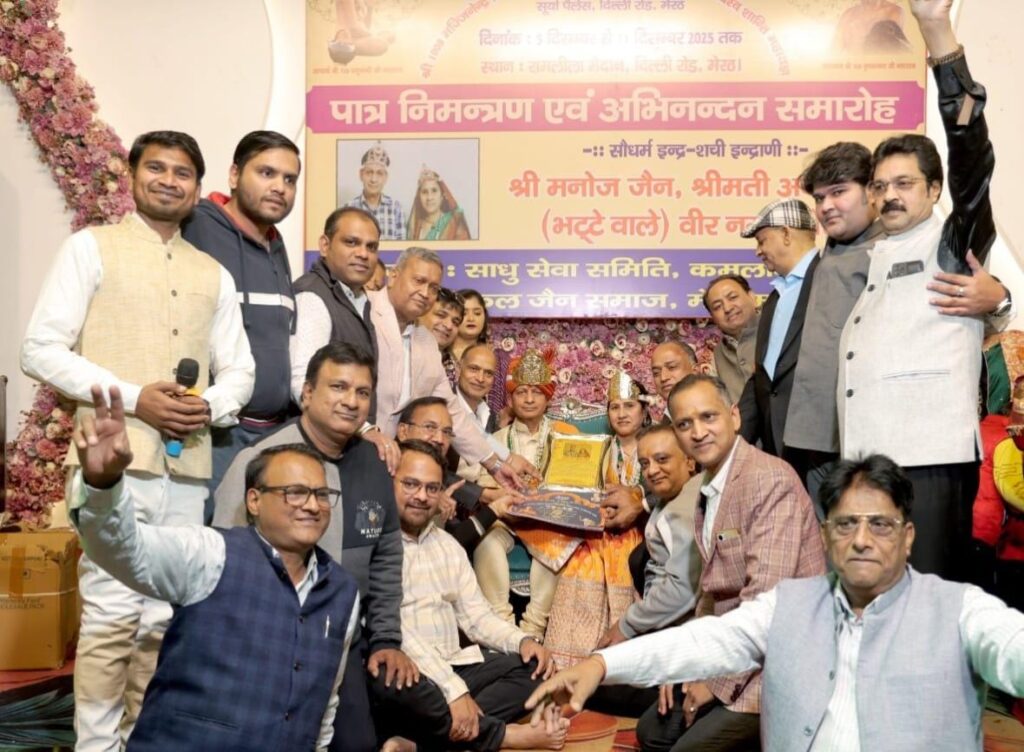 मेरठ। सूर्य पैलेस दिल्ली रोड पर नव निर्मित मंदिर में आज पंचकल्याणक प्रतिष्ठा महोत्सव के मुख्य पात्र सौधर्म इंद्र व सची इंद्राणी का तिलक व आमंत्रण समारोह साधु सेवा समिति द्वारा किया गया तथा पंचकल्याणक महोत्सव में सम्मिलित होने का निमंत्रण दिया गया।