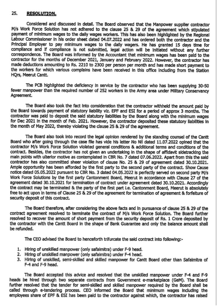 कैँट बोर्ड के अफसरों की उक्त कार्रगुजारी अब फाइलों में अफसरों का सरकारी दस्तावेज बन गई है और छह सौ संविदा सफाई कर्मियों के साथ अयाय को चींख चींख कर बता रही है। दरअसल में 13 जुलाई 2022 की बैठक में (सीबीआर No. 25) में बोर्ड अफसरों के निर्देश पर दर्ज है कि ठेकेदार वर्क फोर्स सॉल्यूशन ने जो संविदा सफाई कर्मचारी काम पर लगाए थे, उनकी मजदूरी नहीं दी। यहां यह भी याद दिला दें कि कैंट बोर्ड के तमाम कर्मचारी नेताओं ने अनेक बार संविदा सफाई कर्मचारियों की मेहनत का पैसा ठेकेदार से दिलाए जाने के लिए अनेकों बार सीईओ कैंट से आग्रह किया था। तमाम मर्तबा उन्हें ज्ञापन भी दिए थे, जिसके बाद जो बोर्ड बैठक 13 जुलाई 2022 को हुई थी उसमें ठेकेदार की सिक्योरिटी मनी जो बैंक में जमा थी, संविदा कर्मचारियों के 23 लाख की रकम निकाल कर संविदा कर्मचारियों को बांटने की बात कही थी, लेकिन ऐसा नहीं हुआ उल्टे एकाउंट सेक्शन के अफसरों ने खेल करते हुए ठेकेदार की सिक्योरिटी मनी ही लौटा दी। सुनने में तो यहां तक आया है कि इस खेल को तत्कालीन सीईओ की छत्रछाया में ठेकेदार को खुश करने के लिए खेला गया था।